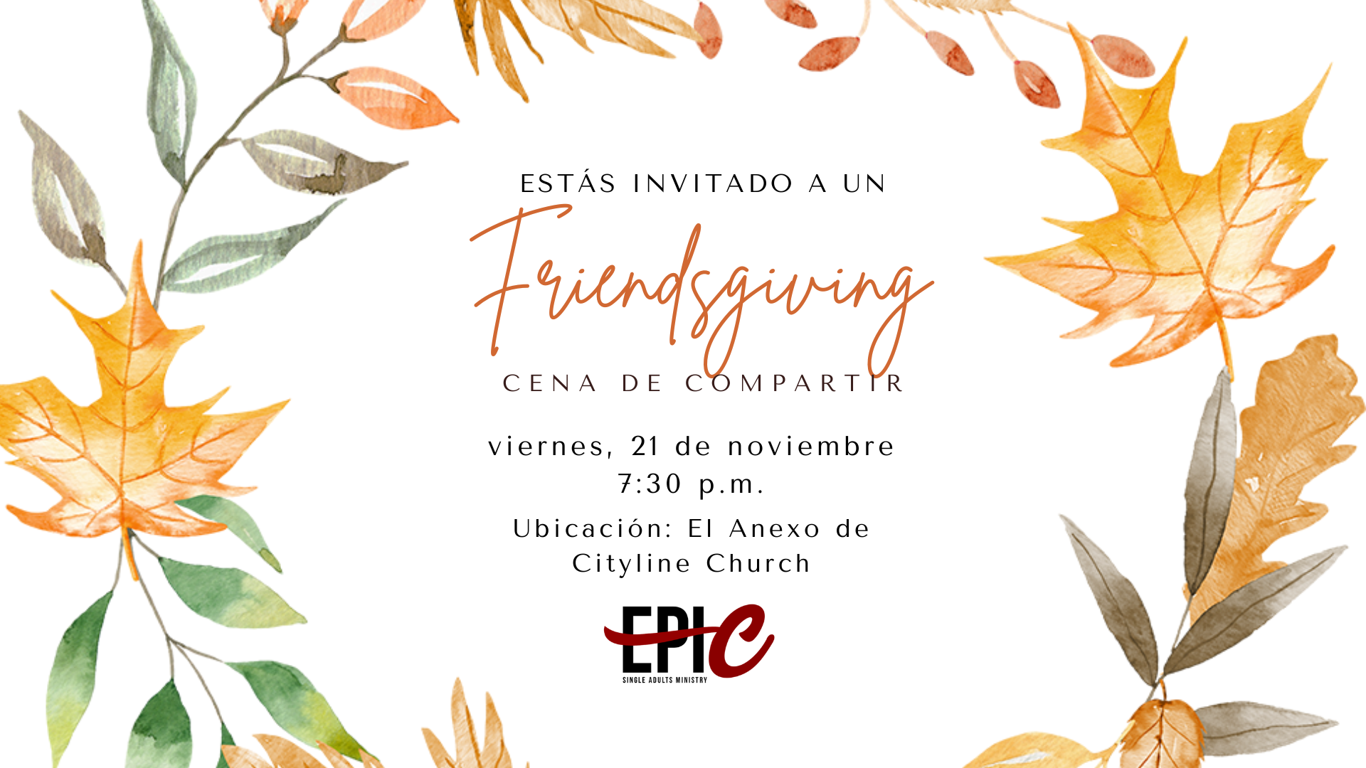 Invitamos a todos los solteros de EPIC de 30 a 62 años, con o sin hijos, a una cena especial entre amigos en el Anexo de Cityline Church el viernes 21 de noviembre a las 7:30 pm. Para más información contacte epic@weareclc.org. Trae un plato para compartir y disfruta de una noche de buena comida y compañerismo. ¡Esperamos verte allí!