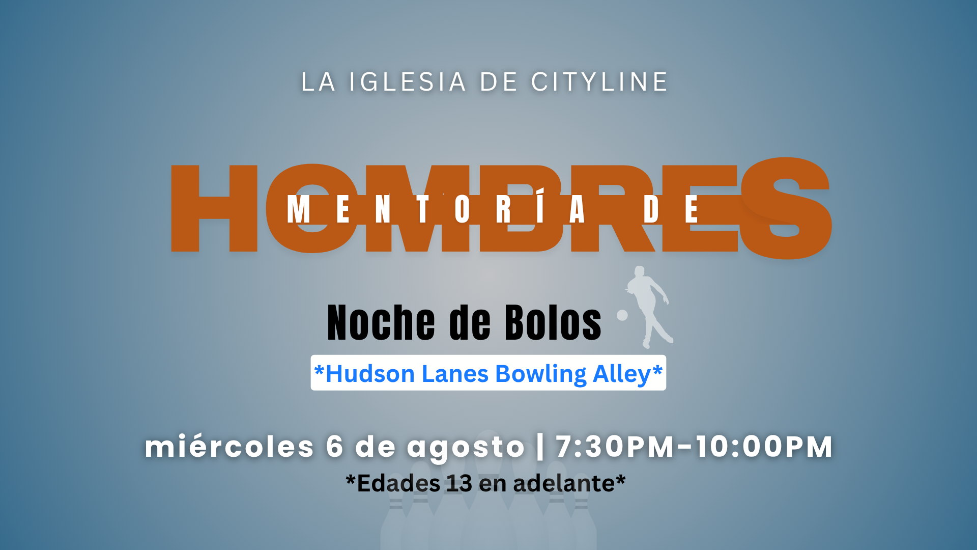¡Llamando a todos los hombres a reunirse! Únete a nosotros para una noche de boliche. Nos encontraremos en Hudson Lanes Bowling Alley, el miércoles 6 de agosto de 7:30 p.m. a 10:00 p.m. REGÍSTRATE AQUÍ a través de la aplicación Church Center—¡las inscripciones ya están abiertas!
