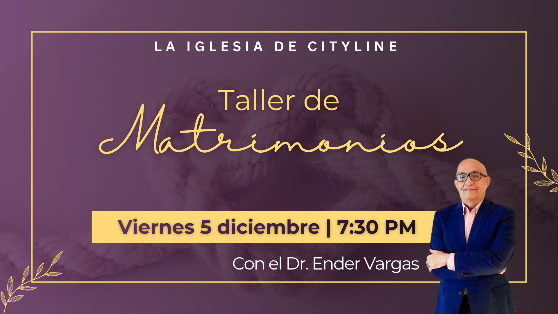 REGÍSTRATE AQUÍ y acompáñanos en un especial Taller de Matrimonios el jueves 5 de diciembre a las 7:30 PM, dirigido por el Dr. Ender Vargas. Ya sea que estén recién casados o tengan muchos años juntos, será una noche para renovar y fortalecer su relación. ¡No se lo pierdan! El Dr. Ender Vargas también estará con nosotros el domingo 7 de diciembre compartiendo la Palabra de Dios. ¡Será un fin de semana lleno de bendición!
