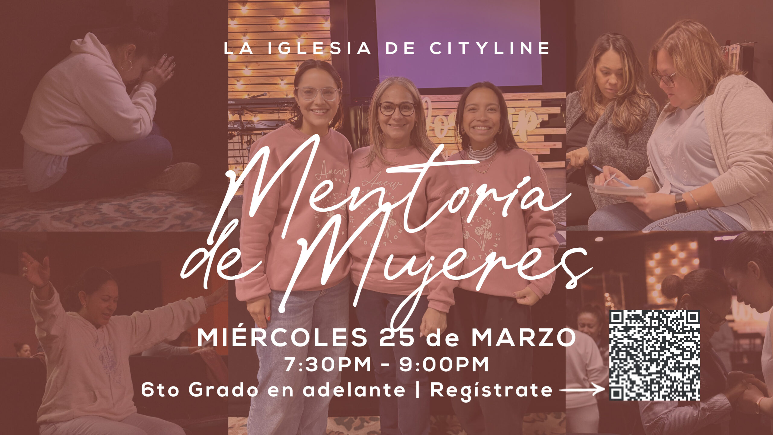 REGÍSTRENSE AQUÍ todas las chicas de sexto grado en adelante, ya que nos encantaría que se unieran a nosotras en nuestra próxima Mentoría para Mujeres con la Pastora Paula el miércoles 25 de marzo de 7:30 p.m. a 9:00 p.m. en el Auditorio de CLC. Regístrense a través de Church Center o con el código QR—¡tenemos muchas ganas de verlas!