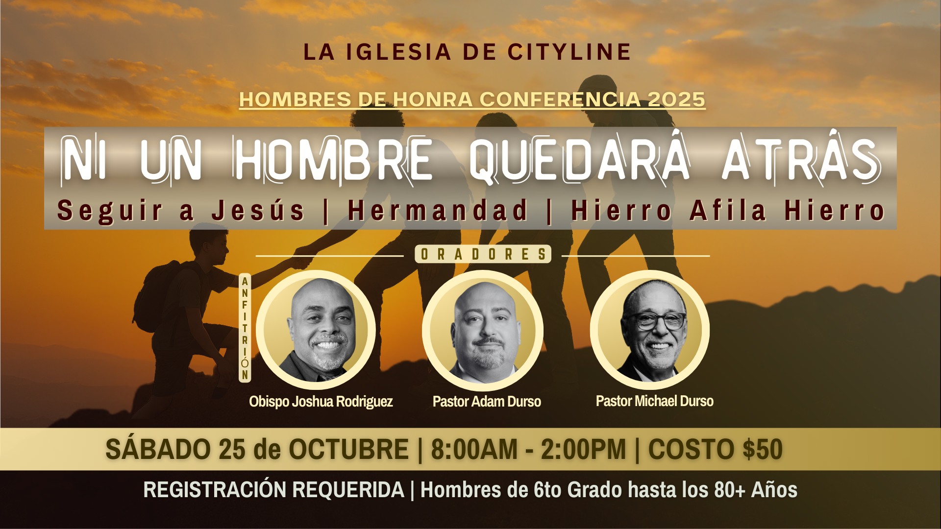 Hombres de Honor, ¡estamos muy emocionados de anunciar nuestra próxima conferencia de hombres titulada: ¡Ni Un Hombre Quedará Atrás! Tendrá lugar desde el sábado 25 de octubre hasta el domingo 26 de octubre. ¡REGÍSTRENSE AQUÍ hoy! Será un tiempo increíble para que los hombres se levanten y tomen su lugar como Líderes Espirituales, Guerreros de Cristo y Proveedores Amorosos. Nos acompañarán los Pastores Michael y Adam Durso, así como nuestro querido Obispo Joshua Rodríguez. Esta conferencia está abierta para hombres desde el 6to grado hasta mayores de 80 años, y el costo de inscripción será de $50. Nos enfocaremos en tres temas principales: Liderar como Jesús, Hermandad, y El Hierro afila el Hierro¡ ¡No te lo puedes perder!